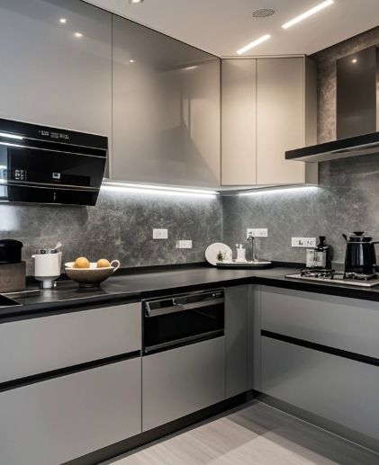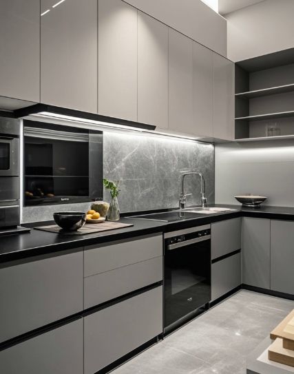 ชุดตู้ครัวไม้สำหรับขาย แผ่นไม้หน้าบานใหม่ ตู้ครัวโมเดิร์นแบบโมดูลาร์ทำจาก MDF ปรับแต่งขนาดได้