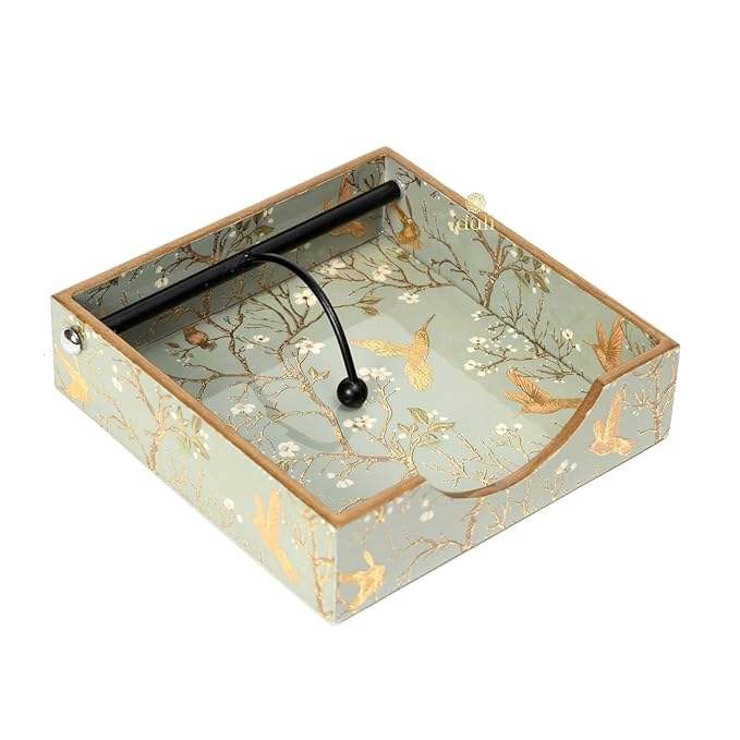 ที่ใส่กระดาษเช็ดปากไม้พร้อมพิมพ์ลายนกและสวนเคลือบเงาตกแต่งอย่างมีสไตล์ที่ใส่กระดาษเช็ดปากพร้อมขาตั้งโลหะสีเงินสีทอง