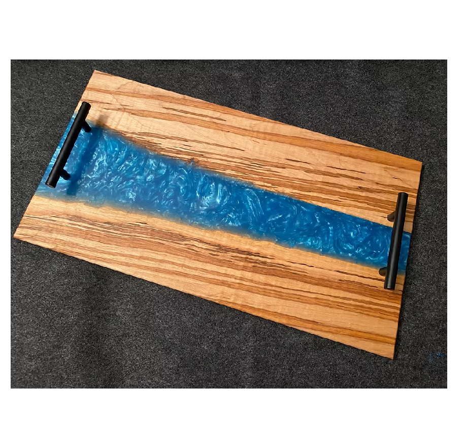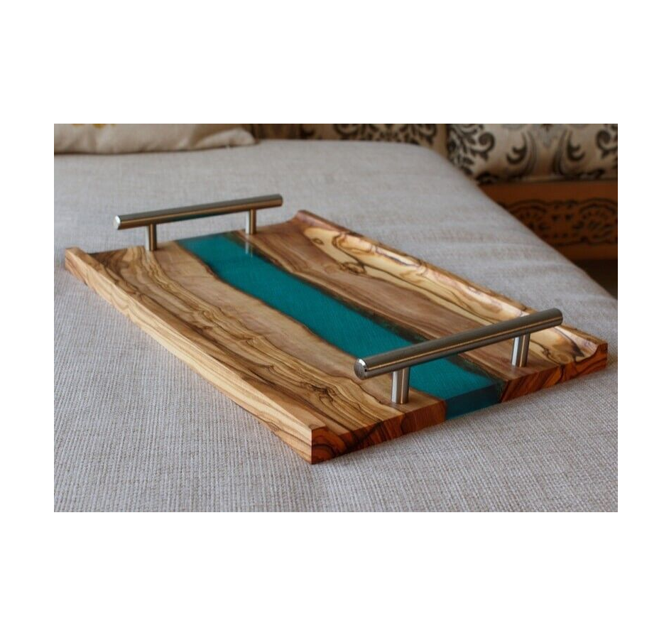 ถาดเสิร์ฟไม้และเรซิ่นสำหรับอาหารเช้าถาดเสิร์ฟพร้อมด้ามจับโลหะถาดเสิร์ฟไม้เรซินแบบเรียบง่าย