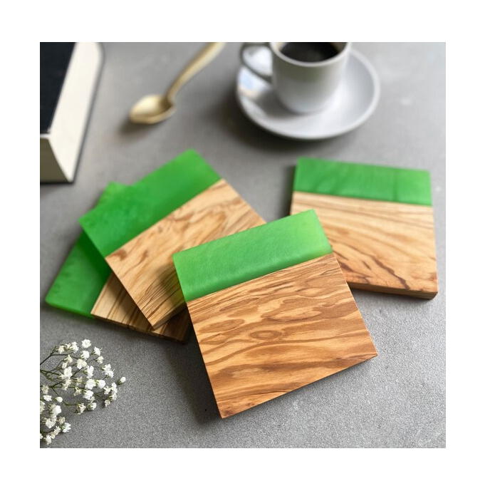 ชุดจานรองแก้วไม้และเรซิ่น พร้อมที่วางจานรองแก้ว 5 ชิ้น ดีไซน์เรซิ่นสีดำ งานฝีมือ จานรองแก้วกาแฟทรงสี่เหลี่ยม