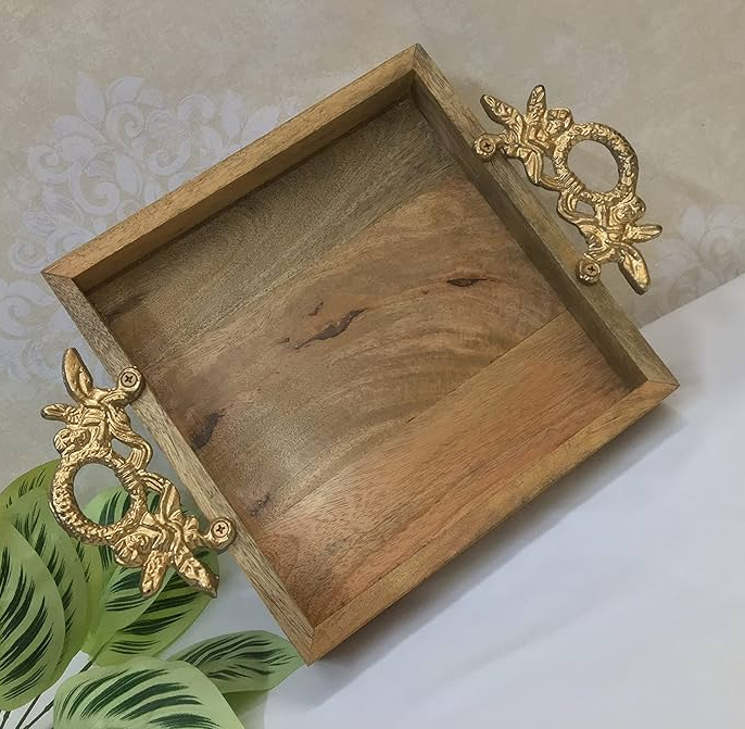 ถาดเสิร์ฟของหวาน wod ถาดเสิร์ฟขนมดีไซน์เป็นเอกลักษณ์งานหัตถกรรมดีไซน์ใบโลหะทำจากไม้