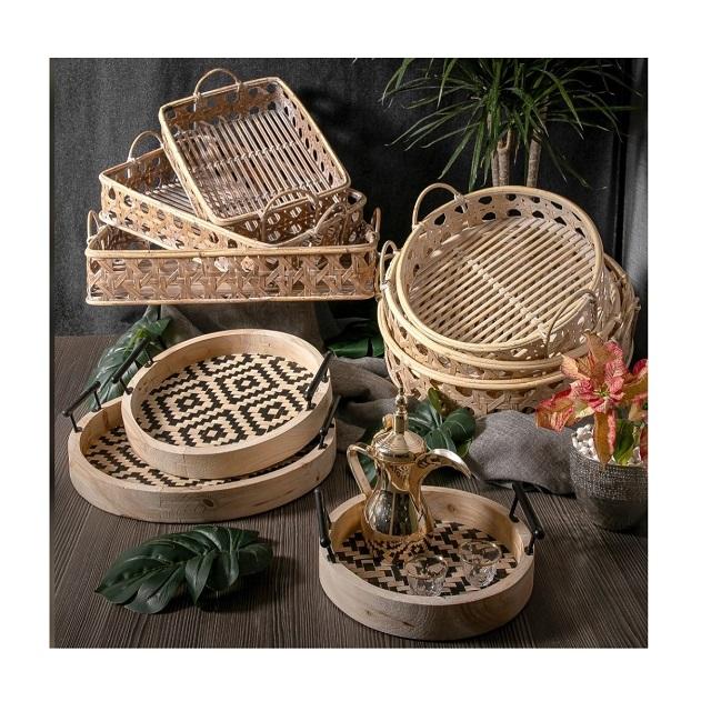 ถาดเสิร์ฟอาหารทำจากไม้และปอกระเจาถาดเสิร์ฟอาหารทรงกลม