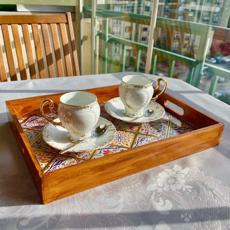 ถาดเสิร์ฟกาแฟลายไม้สไตล์อาร์ตเดโค พร้อมสลักชื่อแบรนด์อเนกประสงค์ ผลิตในอินเดีย สำหรับงานแต่งงาน