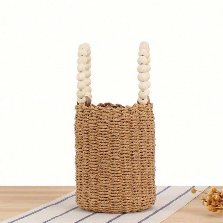 กระเป๋าถือสานทรงกลมประดับลูกปัดไม้ กระเป๋าสะพายไหล่ผู้หญิง สไตล์เรียบง่าย ทำมือ เหมาะสำหรับไปเที่ยวทะเล