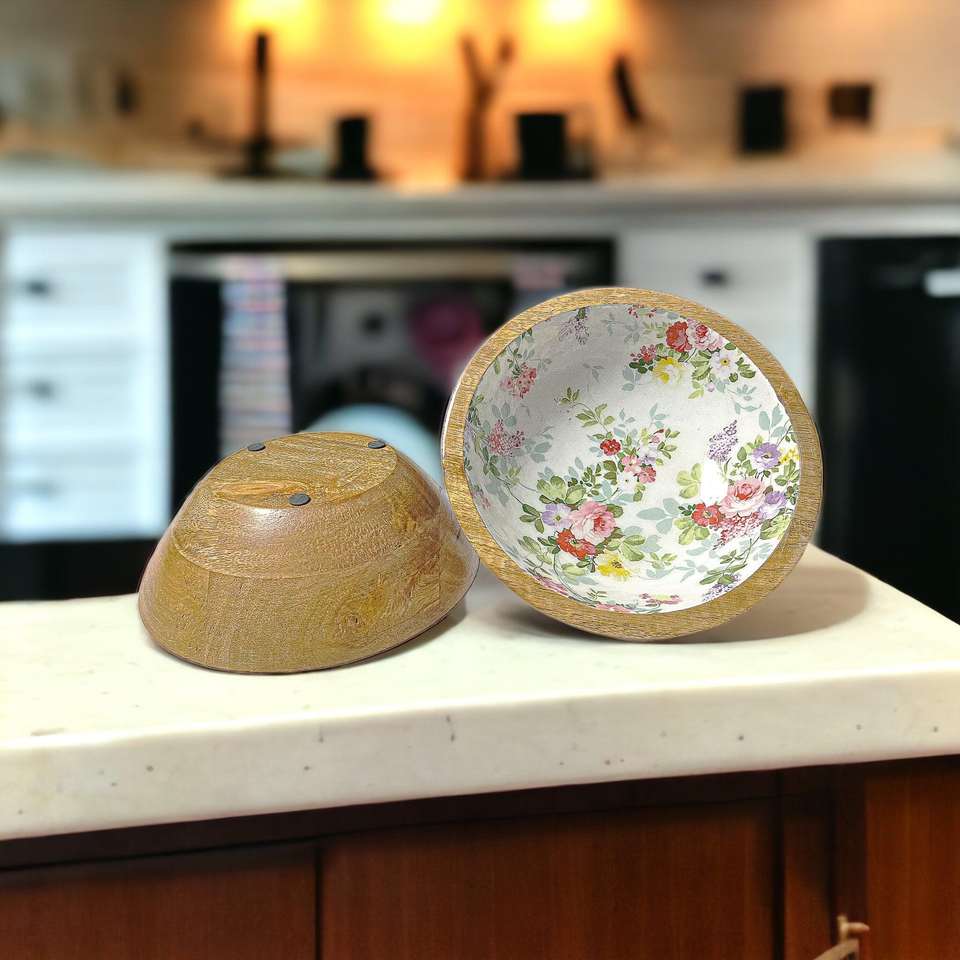 ชุดชามไม้หรูหราทำมือพร้อมช้อน ผลิตด้วยมืออย่างเต็มรูปแบบในอินเดีย-เคลือบลายพิมพ์ ตกแต่งโต๊ะอาหารแบบรักษ์โลก
