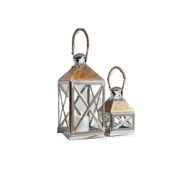 โคมไฟเทียนไม้พร้อมแผงกระจกตารางและด้านบนเป็นสแตนเลสขัดเงาสำหรับตกแต่งบ้าน