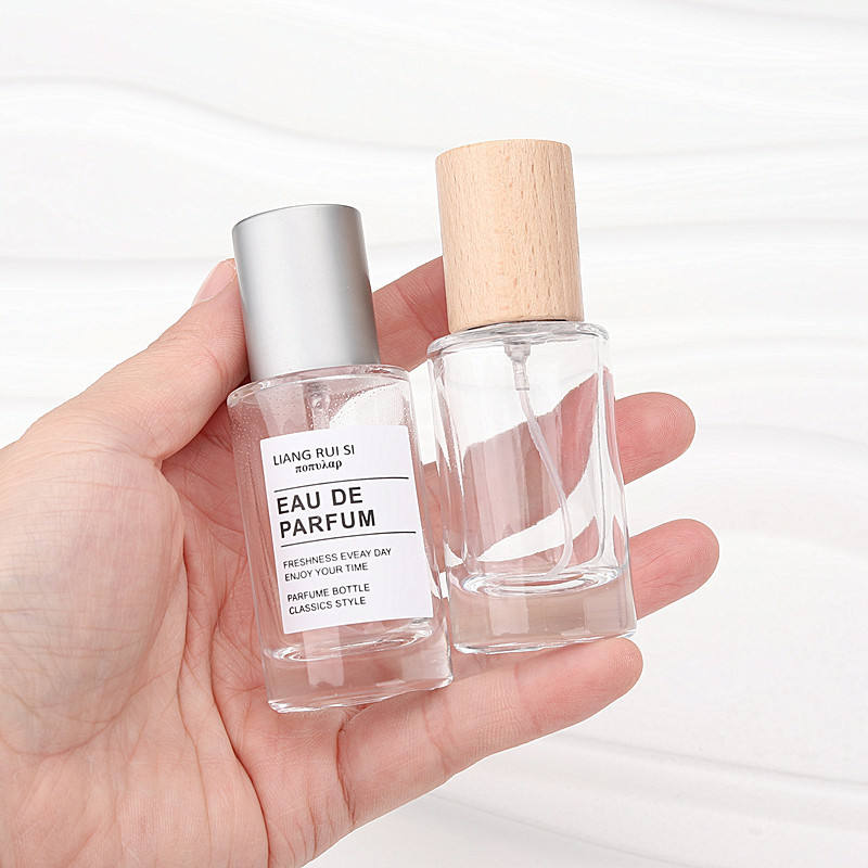 ขวดน้ำหอมแก้วแบบสกรูคอขวด ขนาด 20 มล. ฝาไม้ มีสินค้าในสต็อก บรรจุภัณฑ์เครื่องสำอางแบบเติมได้