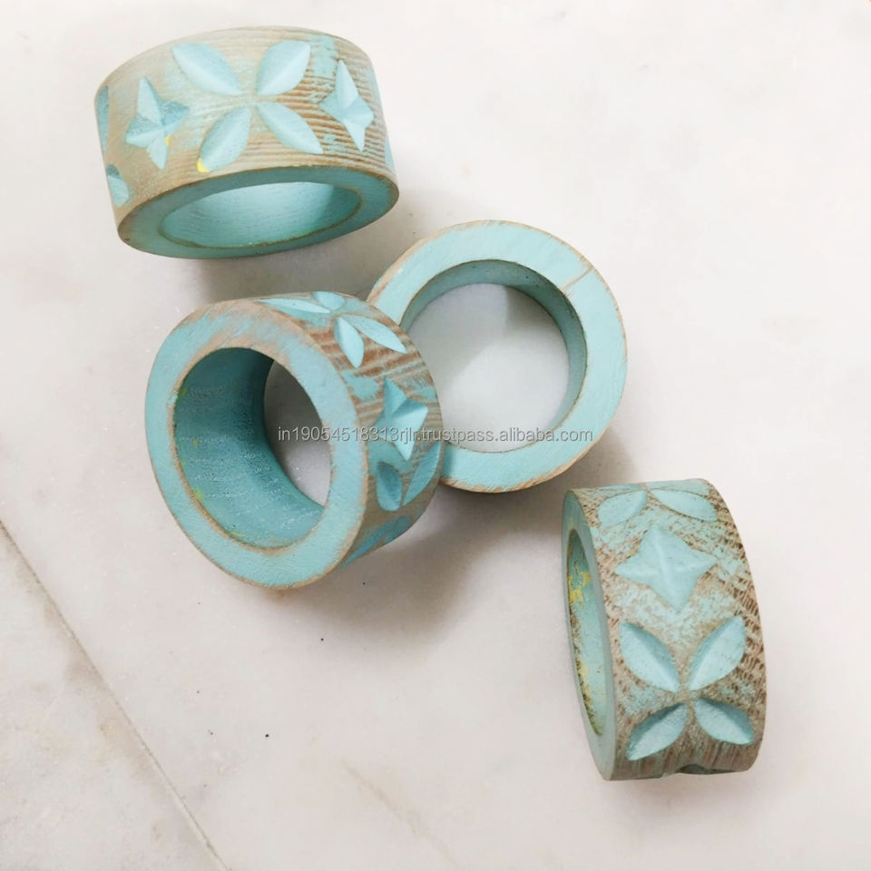 แหวนรองผ้าเช็ดปากไม้แกะสลักลายอินเดียแบบทำมือ ปี 2025 ดีไซน์ทันสมัย เป็นมิตรกับสิ่งแวดล้อม สีฟ้าอ่อน สำหรับตกแต่งโต๊ะงานเลี้ยง