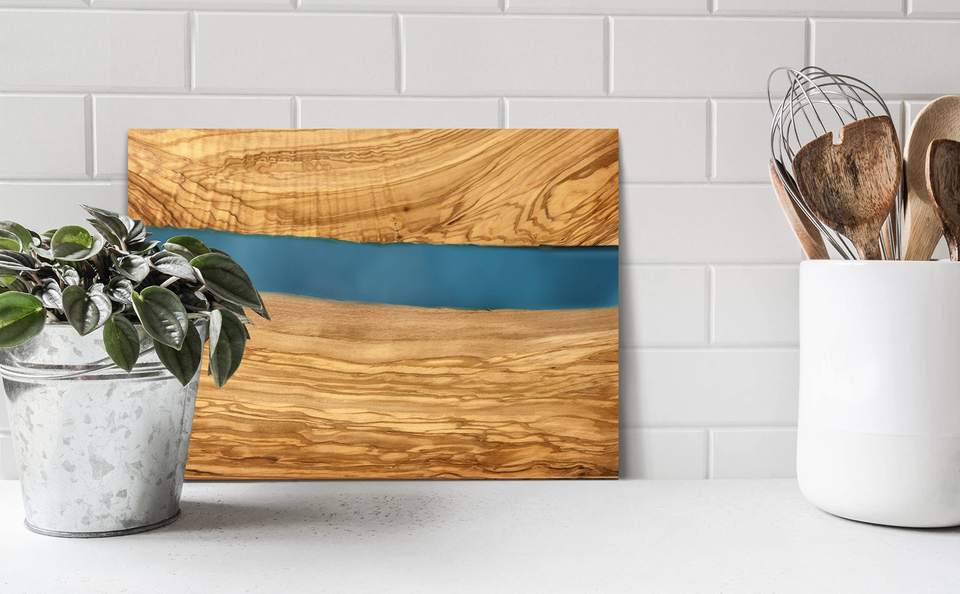 คำอธิบาย:ชุดบอร์ดชีสไม้และชาร์คิวรี่พร้อมงานศิลปะเรซิ่นสีน้ำเงินที่เป็นเอกลักษณ์