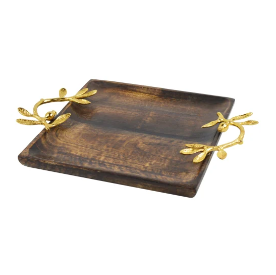 ถาดไม้คริสต์มาสพร้อมที่จับโลหะถาดกาแฟในครัวเรือนถาดเสิร์ฟสี่เหลี่ยมคุณภาพทนทาน