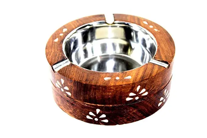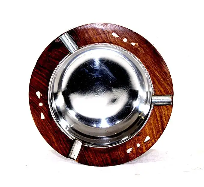 ที่เขี่ยบุหรี่แบบมือถือทำจากอะลูมิเนียมลายไม้ พร้อมลิ้นชักสำหรับเก็บเถ้าบุหรี่แบบมวนเอง สีทองและสีน้ำตาล