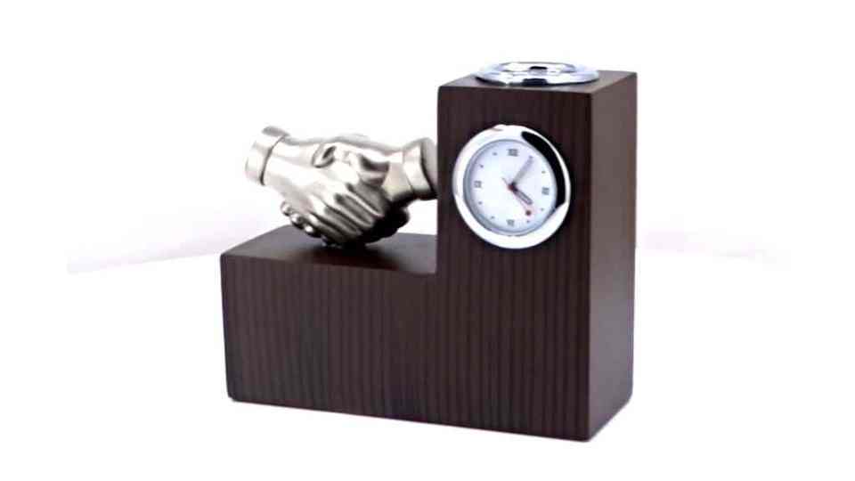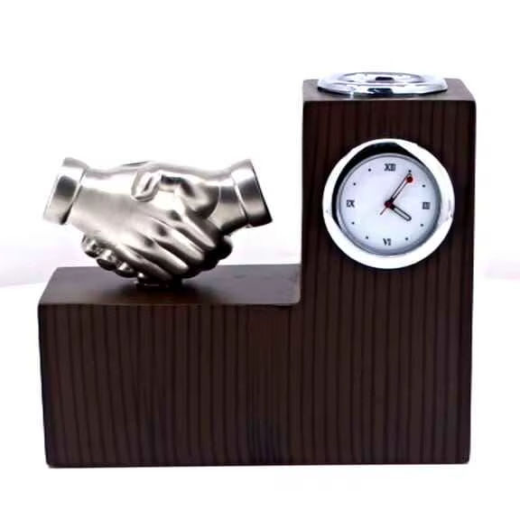 ที่จัดระเบียบโต๊ะทำงานไม้พร้อมนาฬิกาและถ้วยรางวัลรูปมือจับมือ ของขวัญสำหรับองค์กร อุปกรณ์ตกแต่งโต๊ะ