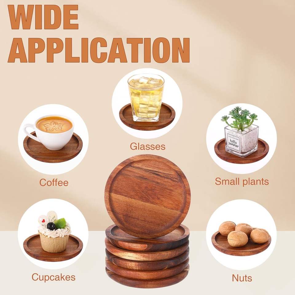ที่รองแก้วเครื่องดื่มไม้จํานวนมาก 5 นิ้วธรรมชาติไม้อะคาเซียถ้วยที่รองแก้วชุดที่รองแก้วนํามาใช้ใหม่วางซ้อนกันได้สําหรับกาแฟ