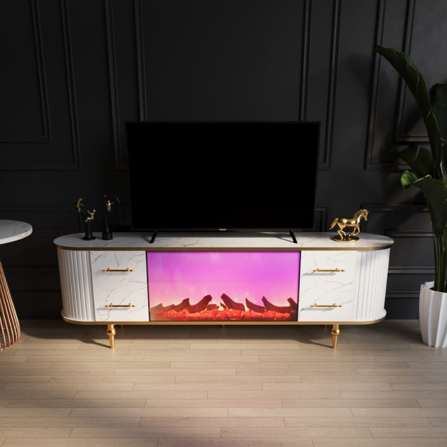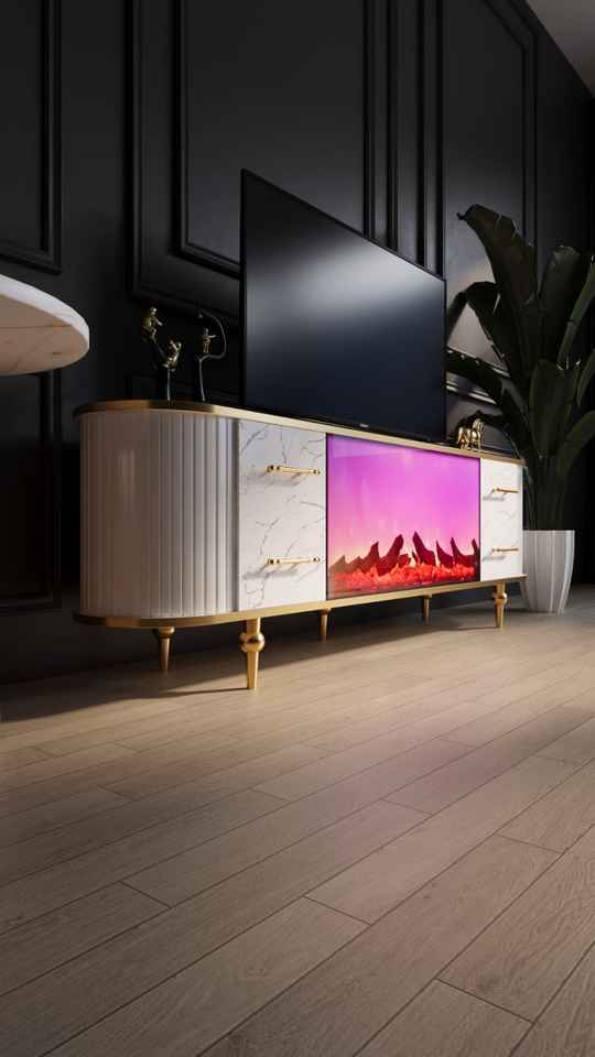 แท่นวางทีวีบนเตาผิงทำจากไม้สีทองทันสมัยและหรูหราพร้อมการเชื่อมต่อบลูทูธ