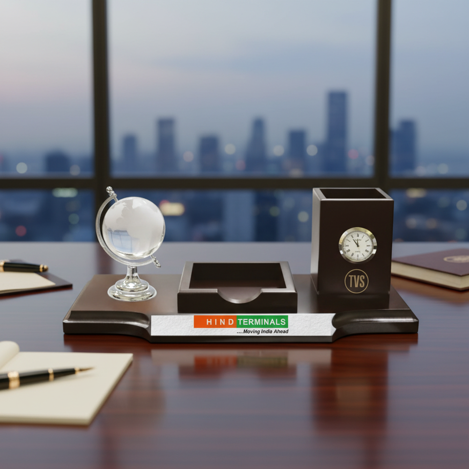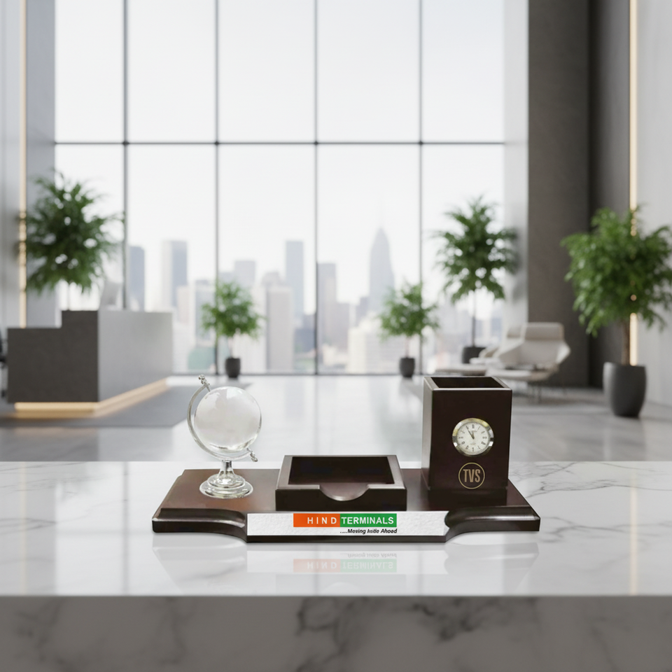 ที่จัดระเบียบโต๊ะทำงานผู้บริหารแบบไม้ พร้อมที่ใส่ปากกา นาฬิกา และลูกโลก ของตกแต่งโต๊ะสำนักงานสำหรับใช้ในองค์กร