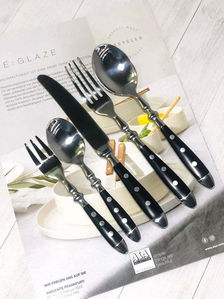 ชุดช้อนส้อมเหล็กสีเงินด้ามไม้ดีไซน์ลายจุดเครื่องใช้บนโต๊ะอาหารคุณภาพสูงเหมาะสำหรับครอบครัวร้านอาหารและครัวในบ้าน