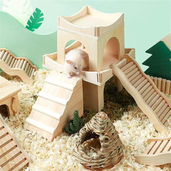 บ้านไม้สำหรับหนูแฮมสเตอร์ของเล่นสำหรับสัตว์เลี้ยงหนูแฮมสเตอร์เล่นไม้บ้านพื้นที่นอน