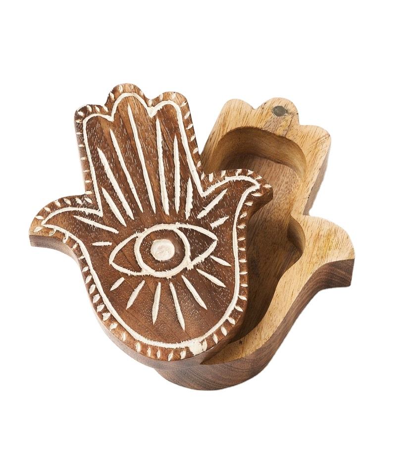 Wooden Jewelry Heart Shape Hamsa Box With Swivel Lid Indian Keepsake Wood Stash Trasure Box Sustainable