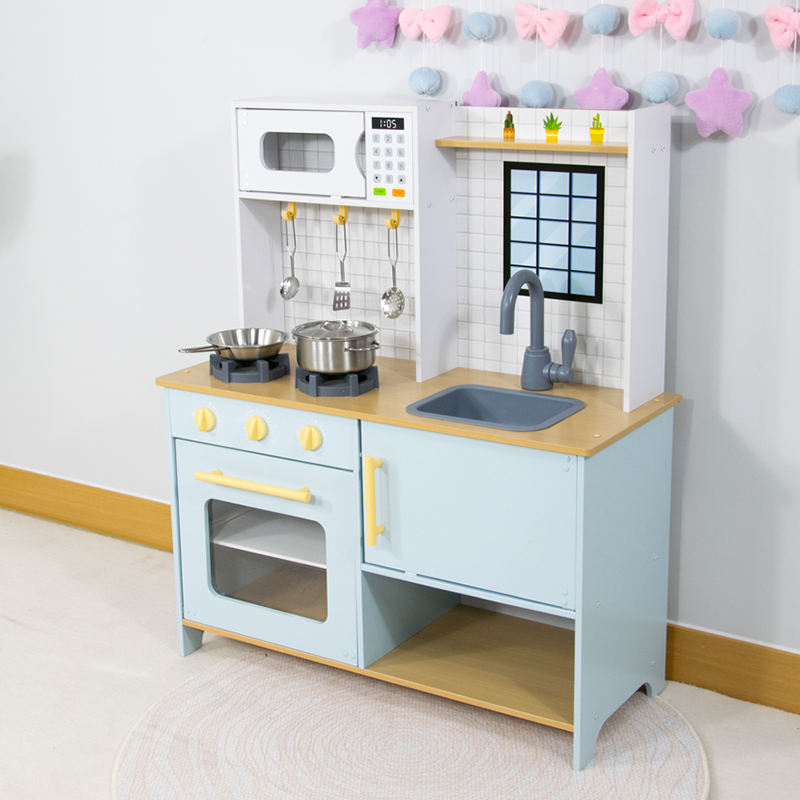 ชุดครัวไม้สำหรับเด็กเล่น พร้อมไมโครเวฟ เตาอบ เตาแก๊ส และอ่างล้างจาน สีฟ้าพาสเทล ชุดทำอาหารเสมือนจริงสำหรับเด็กเล็ก