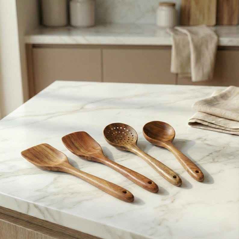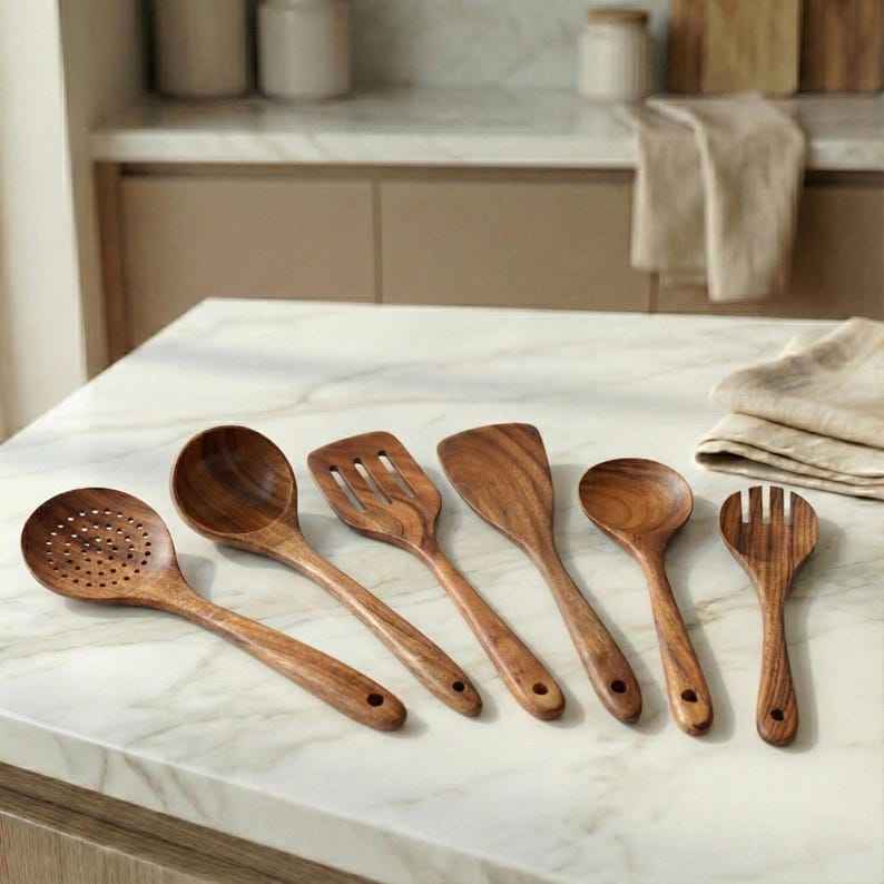 ชุดอุปกรณ์ครัวไม้พร้อมที่วาง ทำด้วยมือ ทันสมัย เรียบง่าย อุปกรณ์ทำอาหาร เป็นมิตรกับสิ่งแวดล้อม ช้อนไม้ ตะหลิว ปลอดภัยสำหรับเครื่องล้างจาน