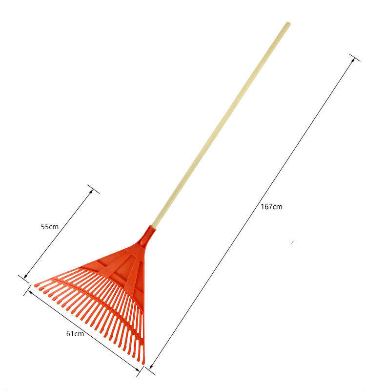 คราดดินด้ามยาวทำจากไม้ หัวพลาสติกแบบโค้งงอ มี 30 ซี่ฟัน ยาว 61 ซม. สำหรับเก็บหญ้าและใบไม้
