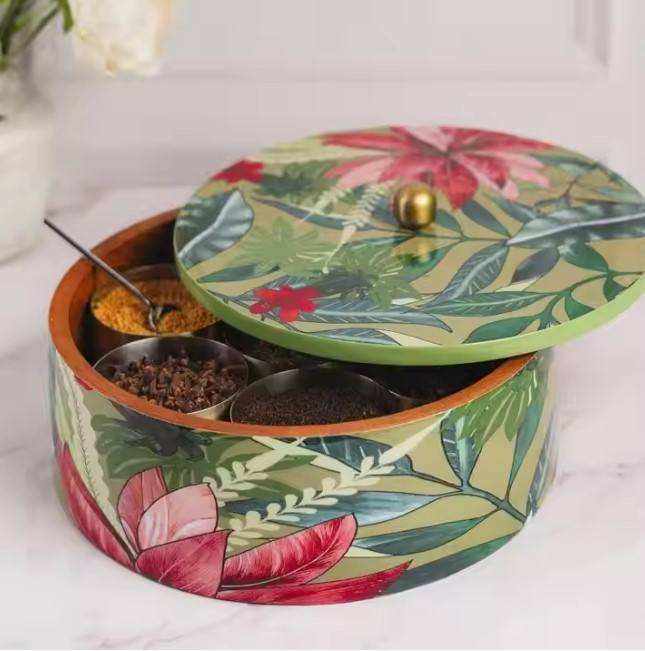 กล่องใส่เครื่องเทศไม้ กล่องทองเหลืองสำหรับห้องครัว พร้อมช้อน กล่องใส่เครื่องเทศทองเหลืองทำมือสำหรับห้องครัว
