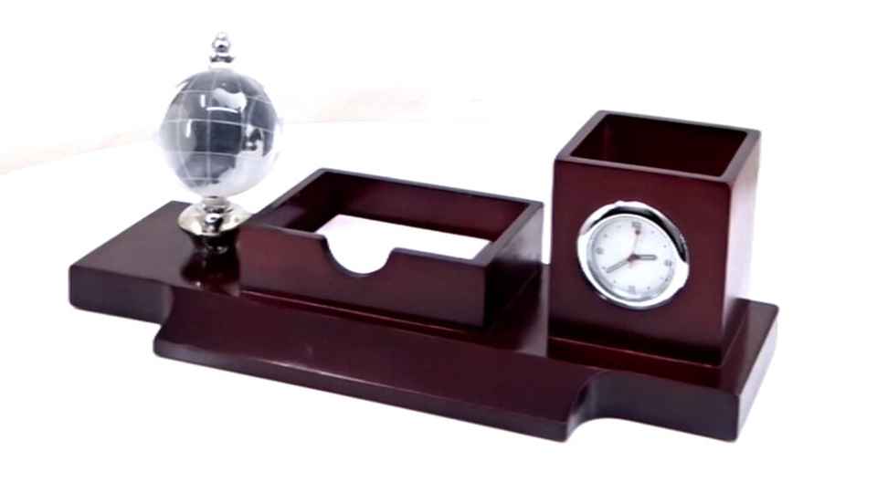 ที่จัดระเบียบโต๊ะทำงานไม้พร้อมนาฬิกา ลูกโลก และที่ใส่การ์ด ของพรีเมียมสำหรับสำนักงาน ของขวัญสำหรับองค์กร