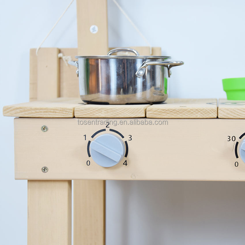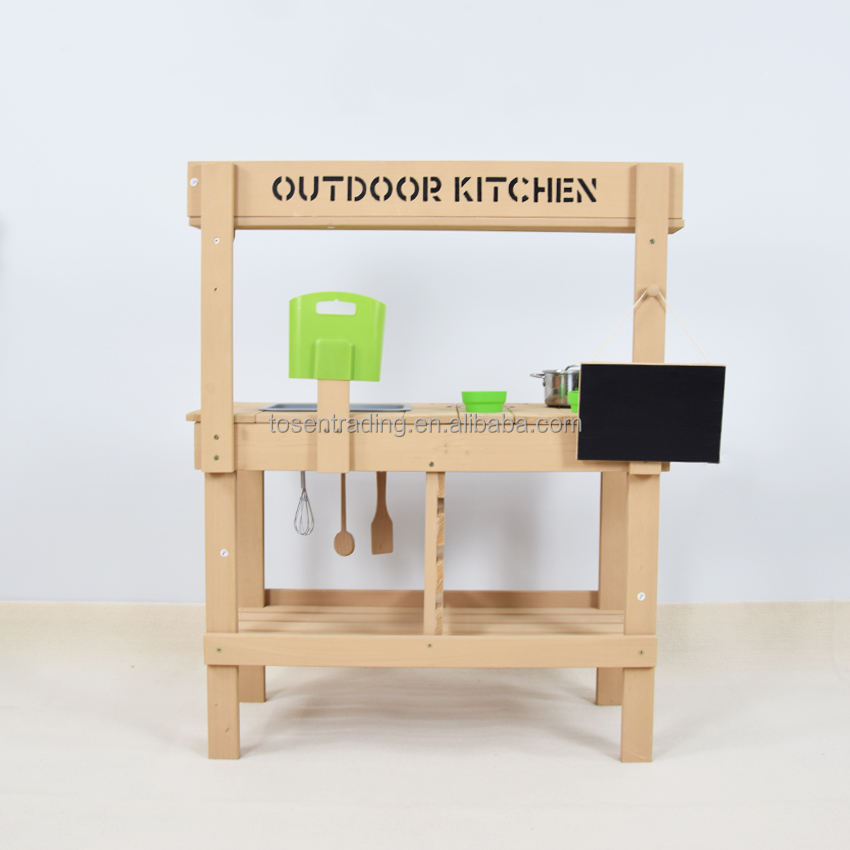 ครัวไม้กลางแจ้งพร้อมกระดานดำ อ่างล้างจาน อุปกรณ์ครัว และชั้นวางของ - ครัวของเล่นสำหรับเด็กในสวนหลังบ้านเพื่อการเล่นเสริมจินตนาการ