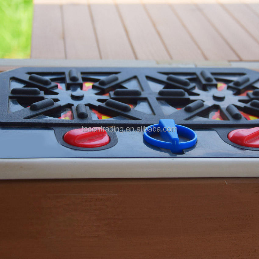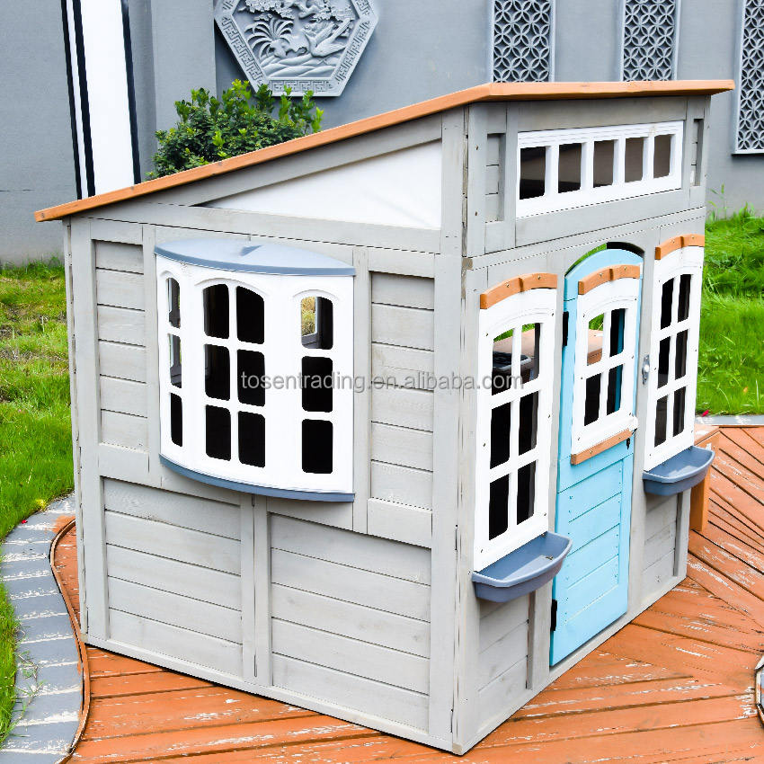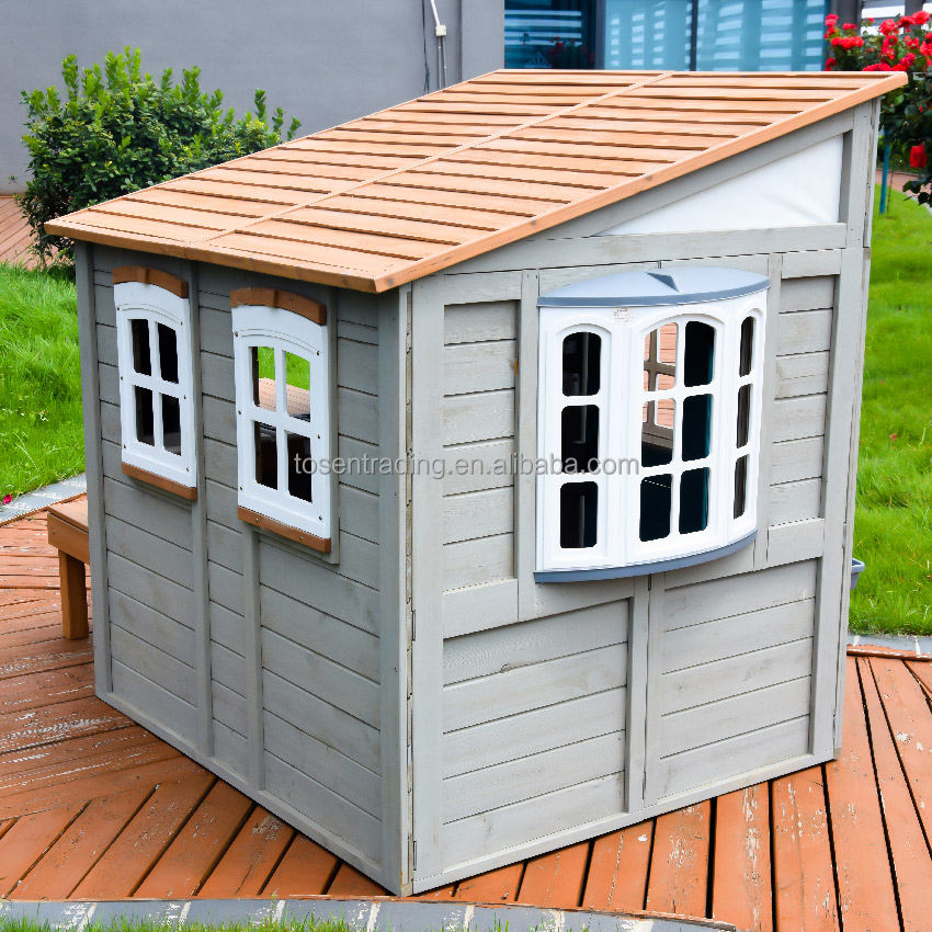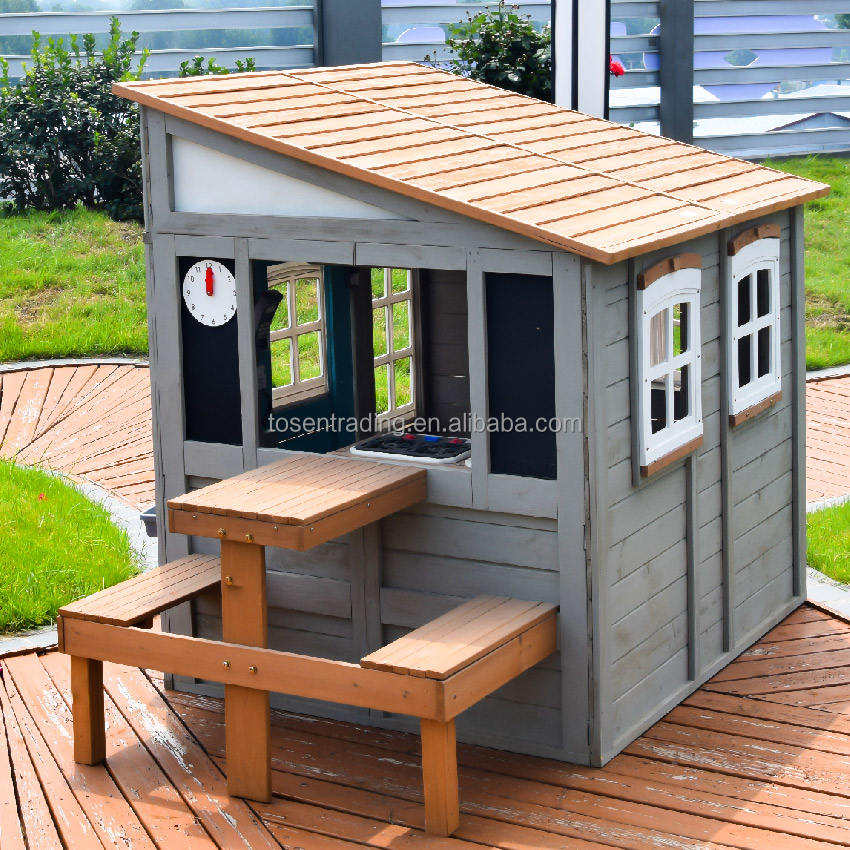 บ้านไม้สำหรับเด็กเล่นกลางแจ้ง พร้อมโต๊ะปิกนิกและม้านั่งในตัว ครัวของเล่น และนาฬิกา - กระท่อมหลังบ้านสำหรับเด็ก