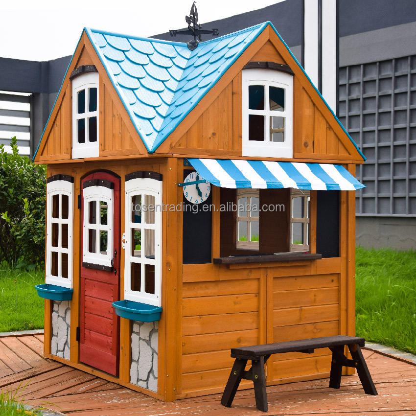 บ้านเด็กเล่นกลางแจ้งหลังคาทรงจั่วสีน้ำเงิน หน้าต่างพลาสติก มีม้านั่ง โครงไม้เป็นมิตรกับสิ่งแวดล้อม สำหรับเด็กเล่นสร้างจินตนาการในสวนหลังบ้าน