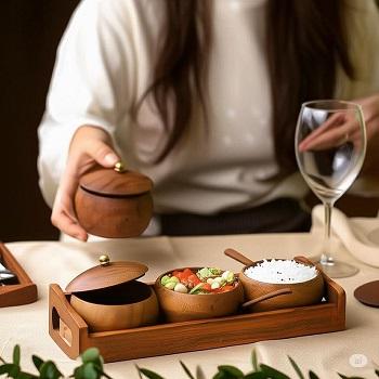 โหลเกลือไม้ย้อนยุคมีฝาปิดและช้อนภาชนะใส่เครื่องเทศโถน้ำตาลทำจากไม้พุทราเปรี้ยวโดย F S I