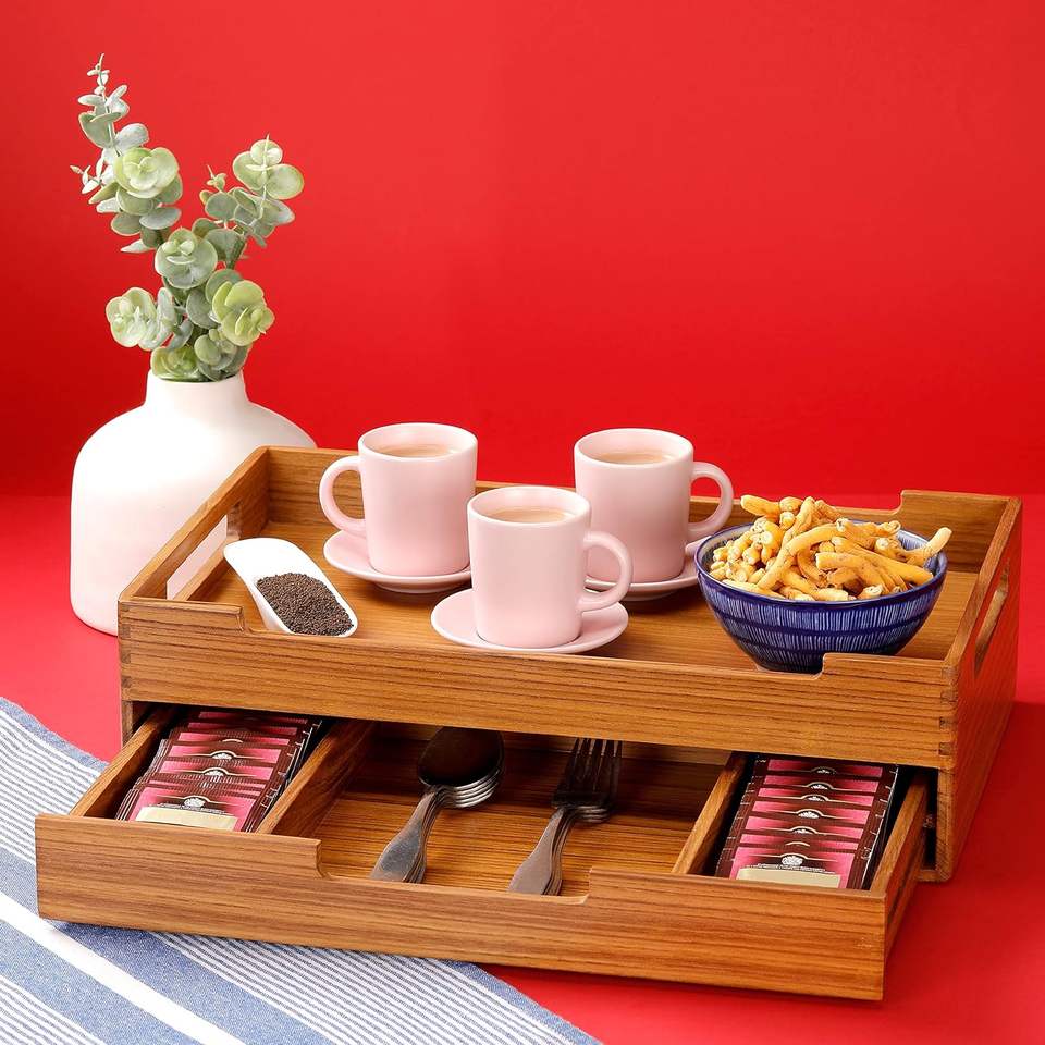 ชื่อผลิตภัณฑ์:ถาดเสิร์ฟไม้พร้อมถุงชาลิ้นชัก2-เกลือ-น้ำตาล-กาแฟ-ชา-เครื่องเทศ