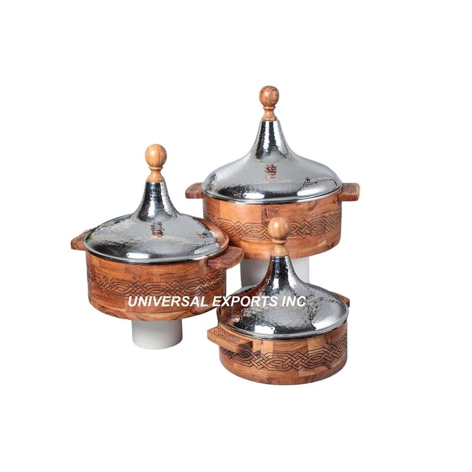 ชุดหม้อไฟสามชิ้นทำด้วยมือชุดไม้หม้ออุ่นอาหารโลหะสำหรับตกแต่งใหม่ล่าสุด