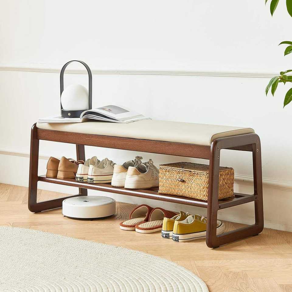ชั้นวางรองเท้าไม้พร้อมที่นั่งหนัง ประหยัดพื้นที่สำหรับจัดระเบียบทางเข้า
