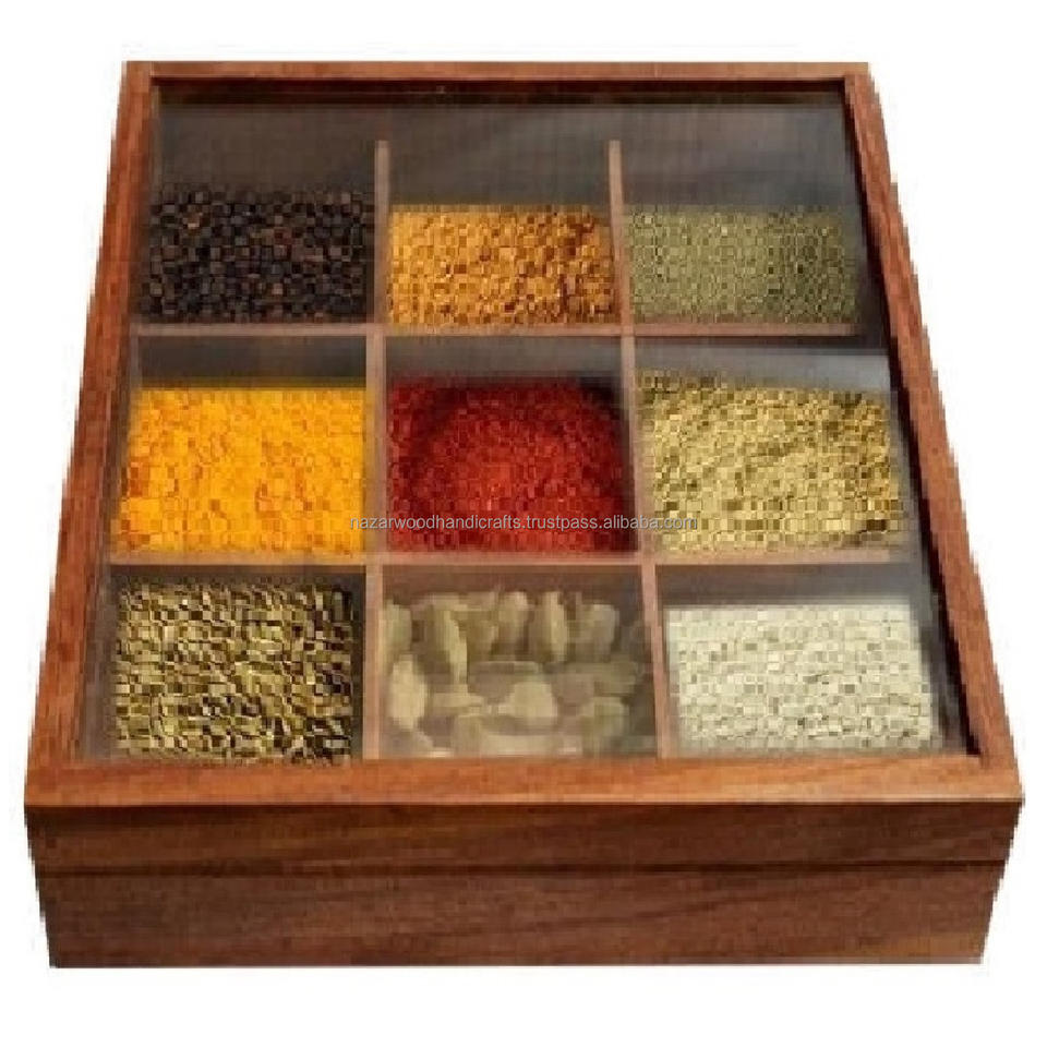 Wooden Spice Box Set of 9 Containers Table Top Masala Dabba Jars With Spoon Gift Spice Box Wooden Box for Spices