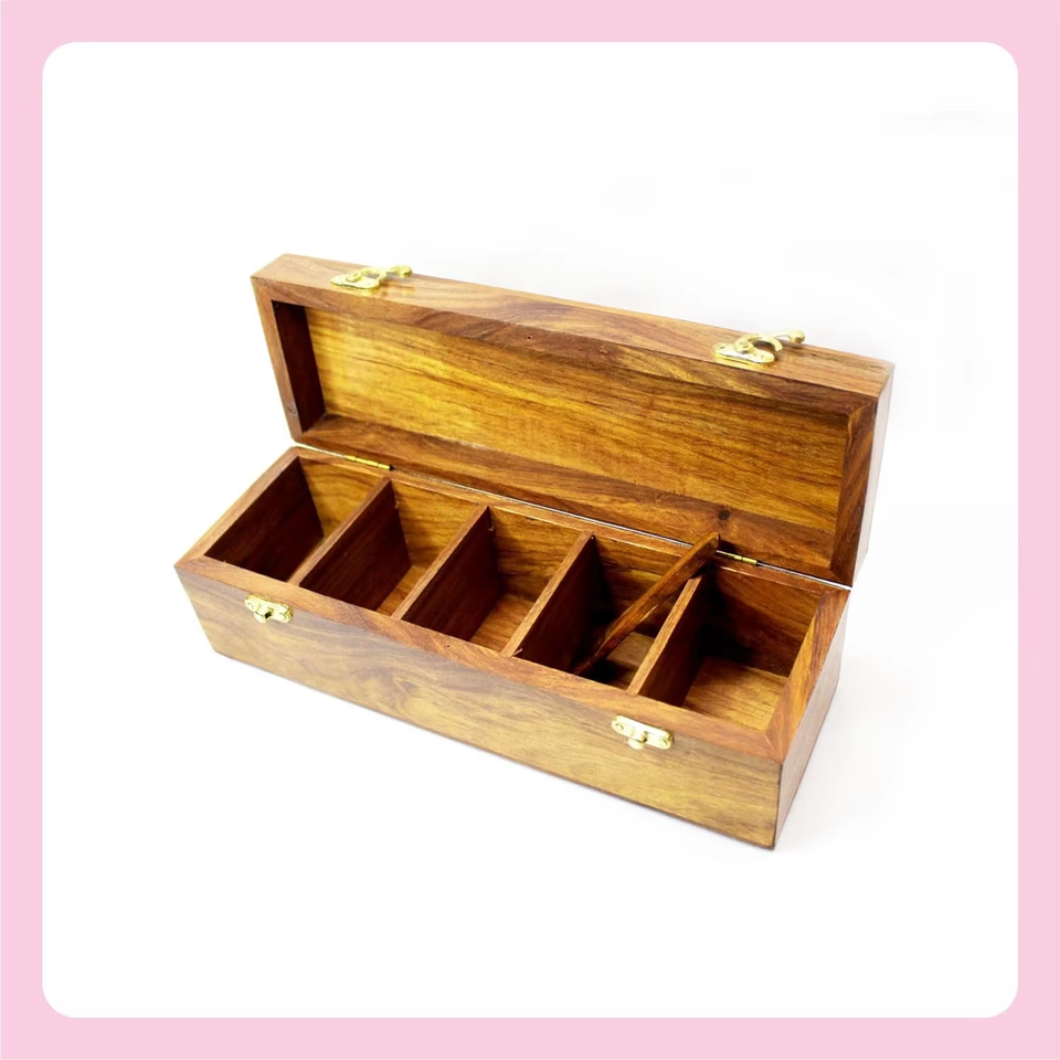 ชุดกล่องเครื่องเทศไม้5ช่องและช้อนเหมาะสำหรับเครื่องเทศผลไม้แห้งมาซาลาบอกซ์สำหรับตกแต่งครัวบ้านและห้องครัว