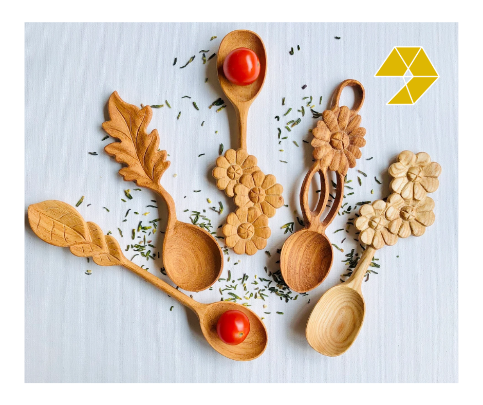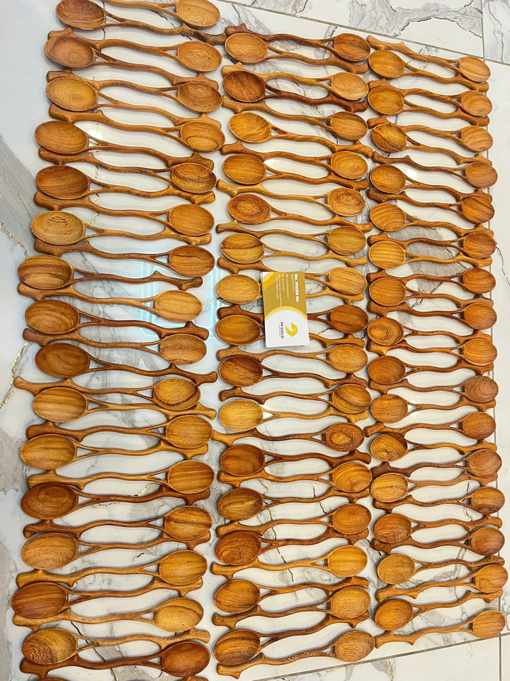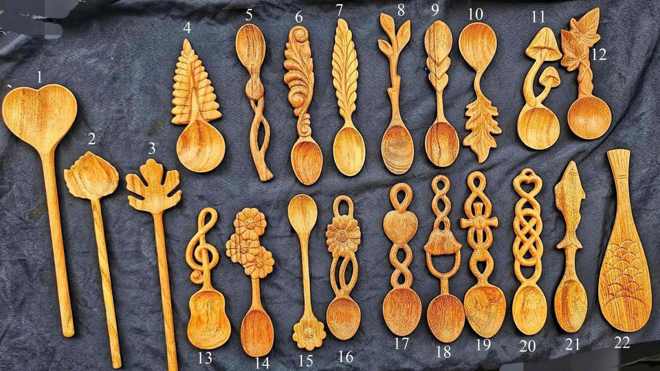 ช้อนไม้ด้ามใบไม้ ลายสามใบ ช้อนไม้ทำมือ ช้อนไม้แกะสลักลายใบไม้และดอกไม้ ผลิตในเวียดนาม