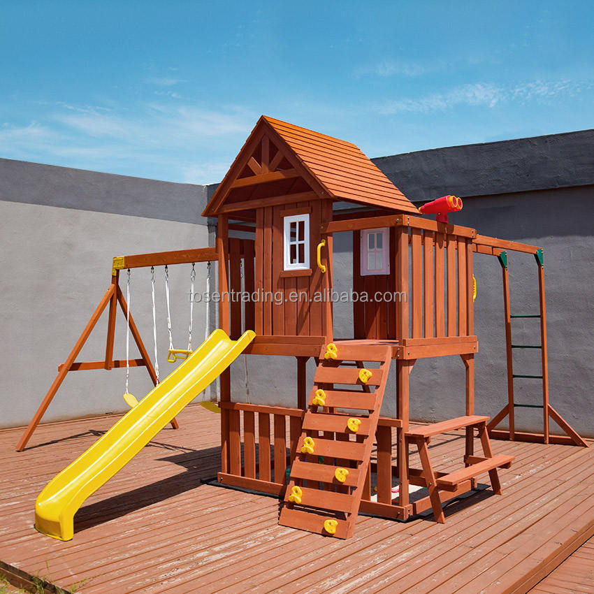 ชุดชิงช้าไม้พร้อมบ้านเด็กเล่น สไลเดอร์สีเหลือง ชิงช้า บาร์โหน และกล้องโทรทรรศน์ - ชุดสนามเด็กเล่นสำหรับสนามหลังบ้าน