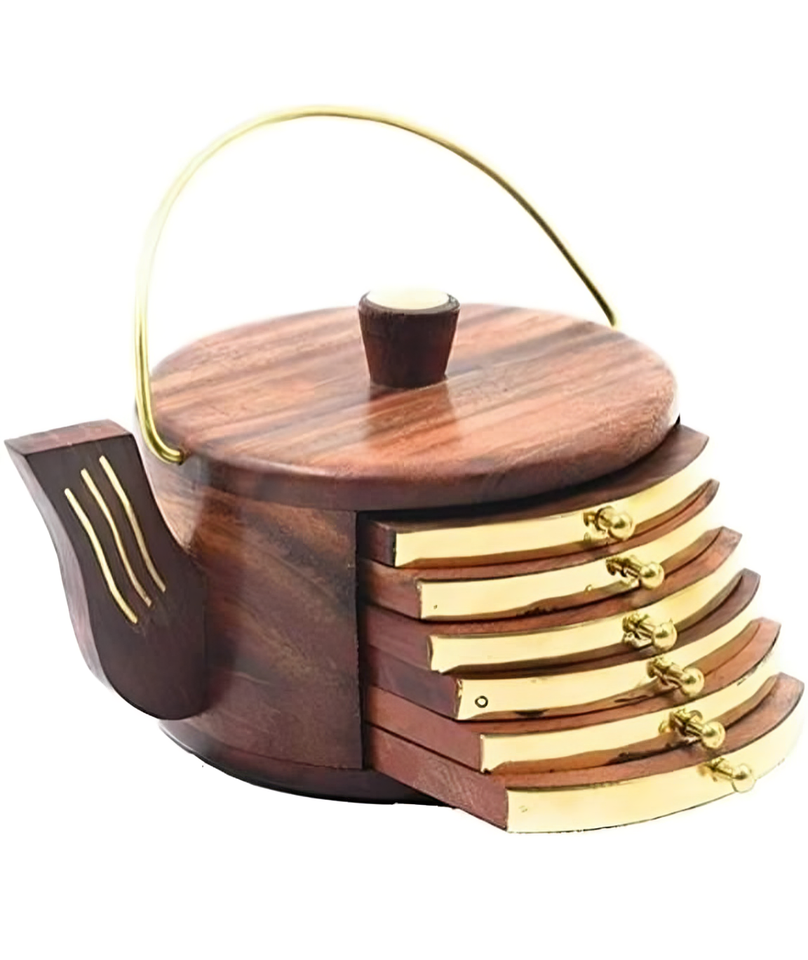 ชุดที่รองแก้วกาน้ำชาไม้พร้อมที่วางที่รองแก้วทำมือที่ทันสมัยพร้อมสำเนียงทองเหลืองสำหรับรับประทานอาหารชากาแฟ