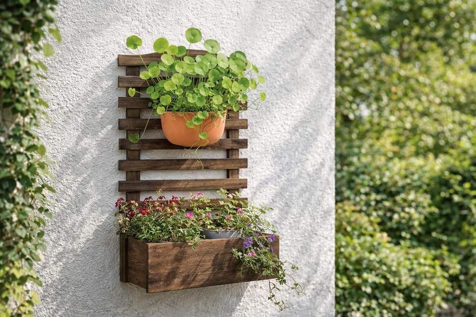ชั้นวางกระถางต้นไม้ติดผนังไม้สำหรับใช้ภายในและภายนอกอาคาร | ผนังสวนแนวตั้งแบบแขวนพร้อมกระถางดอกไม้ | ที่วางต้นไม้ไม้สไตล์เรียบง่าย