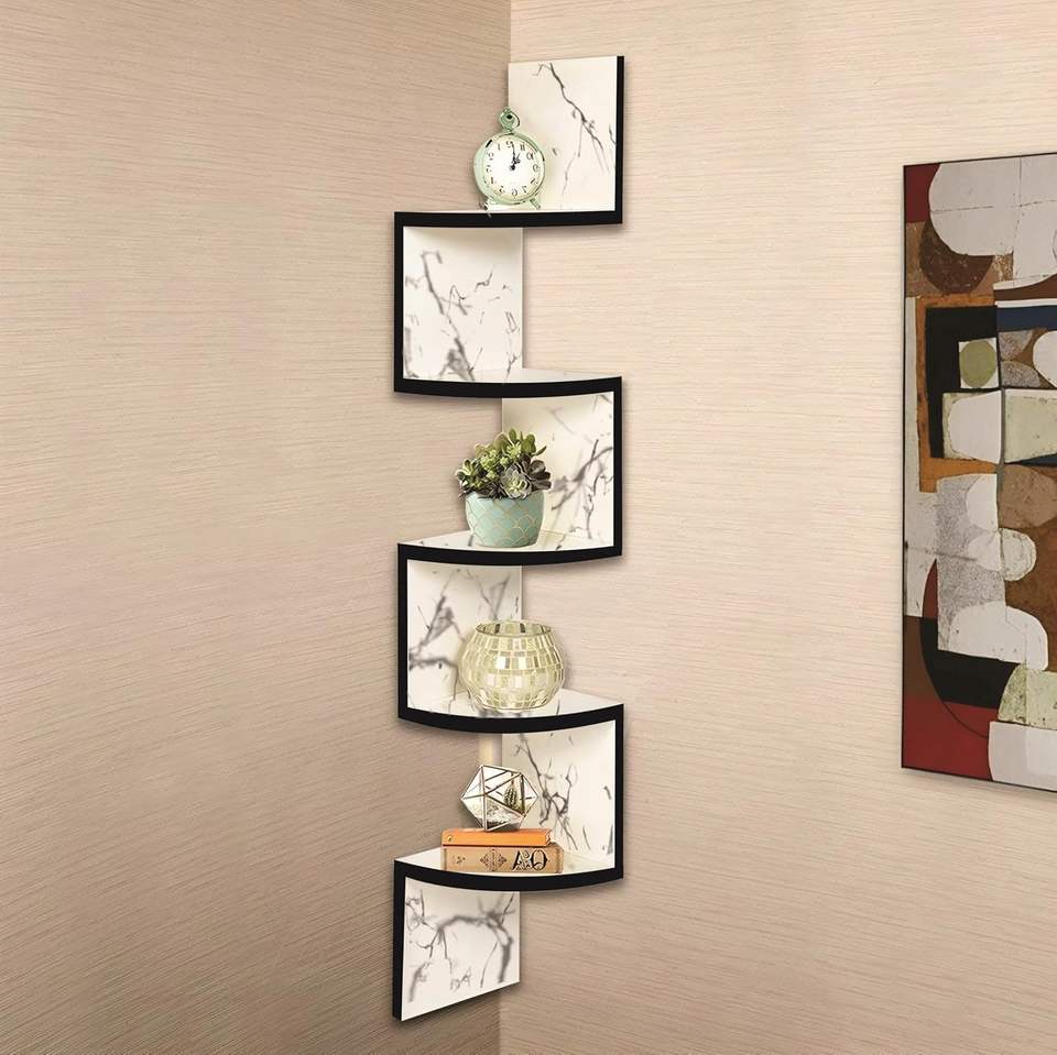ชั้นวางของติดผนังไม้ | ชั้นวางของแขวนมุมสำหรับห้องนั่งเล่น ดีไซน์ทันสมัย | ชั้นวางของตกแต่งบ้านแบบลอยได้ Zig Zag สำหรับจัดเก็บของ สีขาว