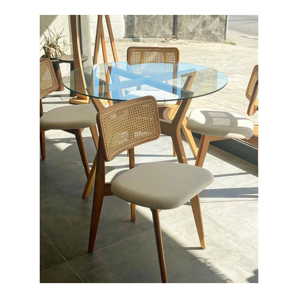 เก้าอี้ทานข้าวไม้ โครงหวายถัก หุ้มเบาะผ้าสีอ่อน สำหรับใช้ภายในอาคาร