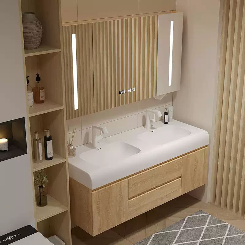 ตู้ไม้สองชั้นแบบบูรณาการกันลมสำหรับห้องน้ำตู้กระจกในห้องน้ำอ่างล้างหน้าในห้องน้ำ