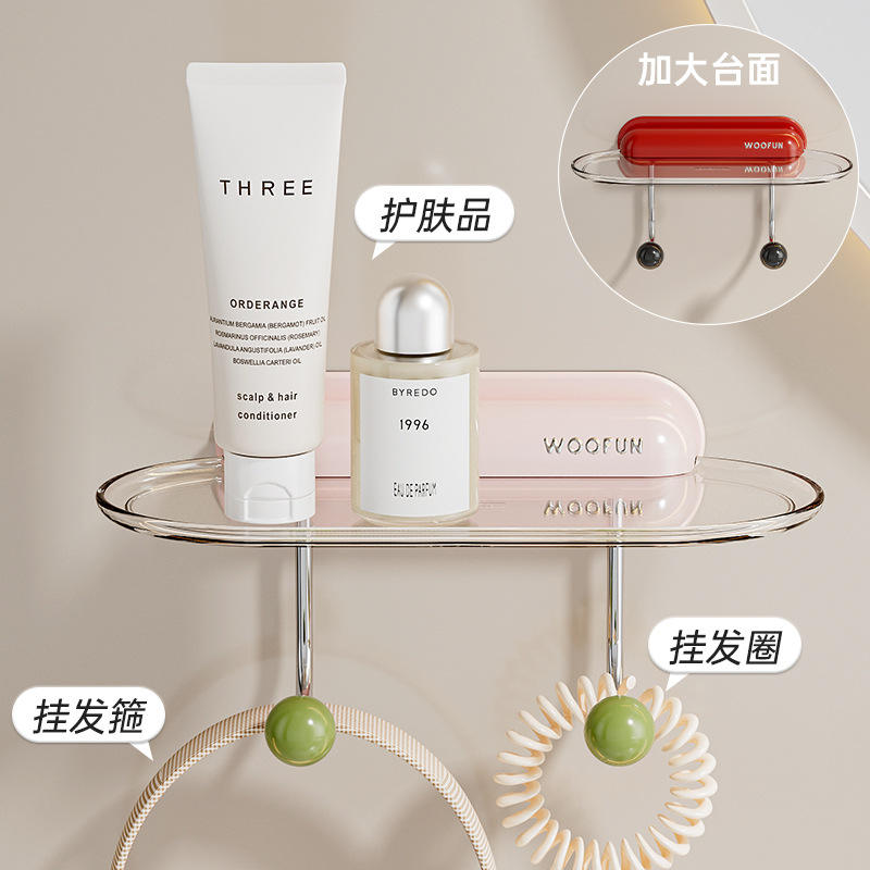 ชั้นวางของในห้องน้ำวูฟันแบบวงรีติดตั้งด้วยระบบสุญญากาศพร้อมตะขอสำหรับจัดเก็บผลิตภัณฑ์ดูแลผิวและเครื่องสำอาง ดีไซน์ทนทาน