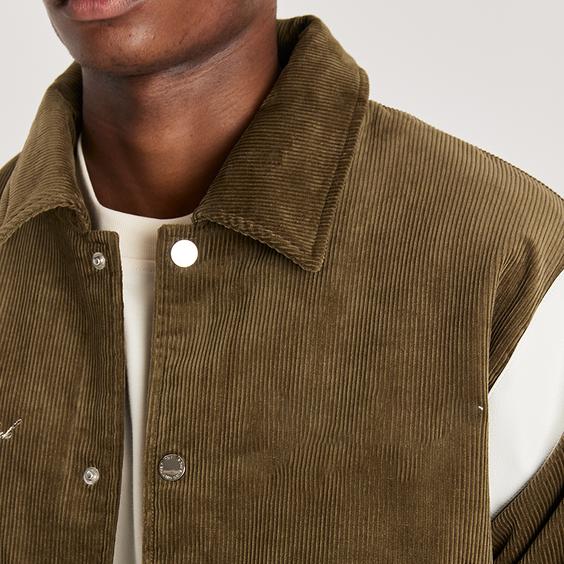 เสื้อแจ็คเก็ตวาร์ซิตี้มีฮู้ดสำหรับผู้ชาย ผ้าขนสัตว์ผสมผ้าแคนวาส แขนหนัง 2 สี สไตล์สตรีทแวร์ สำหรับฤดูหนาว กันลม ใส่สบาย อุ่น รับผลิตแบบ OEM/ODM