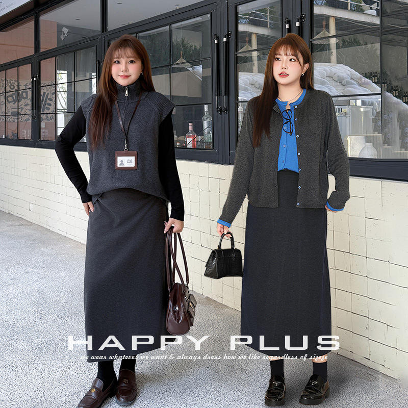 กระโปรงทรงเอเอวสูงผ้าวูลเท็กซ์เจอร์สีเทาเข้ม ไซส์พลัส 90-94 กระโปรงผู้หญิงสำหรับฤดูใบไม้ร่วงและฤดูหนาว มีรอยผ่า ยืดหยุ่นเล็กน้อย