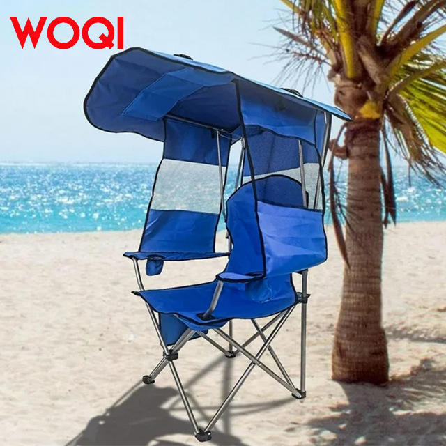 เก้าอี้ชายหาด Woqi พร้อมหลังคาบังแดดแบบพับได้สำหรับผู้ใหญ่ มีที่วางแก้ว ช่องเก็บของด้านข้าง สไตล์แคมป์ปิ้ง ขนาด 58x58x90 ซม.