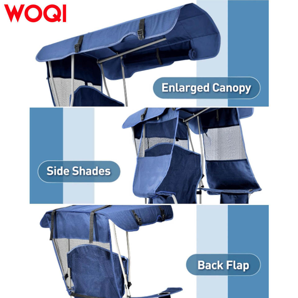 เก้าอี้ชายหาดพับได้ Woqi พร้อมหลังคาบังแดด ที่วางแก้ว และช่องเก็บของด้านข้าง สำหรับตั้งแคมป์กลางแจ้ง