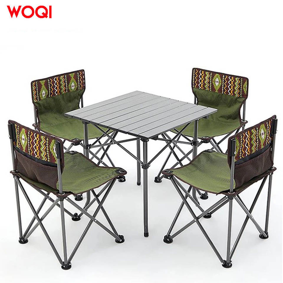 ชุดโต๊ะและเก้าอี้พับได้ Woqi สำหรับตั้งแคมป์ รูปทรงสี่เหลี่ยม พกพาสะดวก สำหรับปิกนิก บาร์บีคิว เฟอร์นิเจอร์กลางแจ้ง สีเขียวมะกอก ผ้า Oxford 4 ที่นั่ง