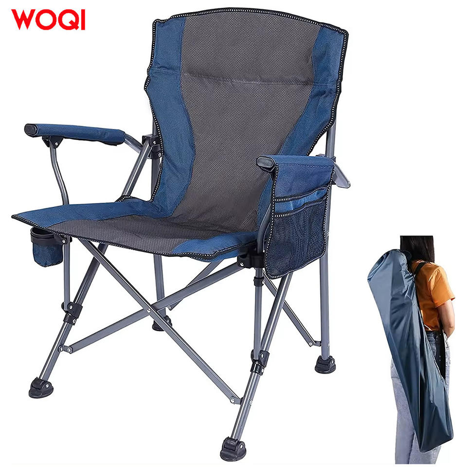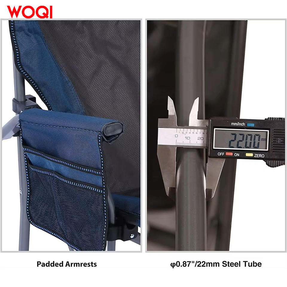 เก้าอี้แคมป์ปิ้งพับได้ Woqi ทำจากอลูมิเนียม พร้อมที่วางแก้วและช่องเก็บของด้านข้าง ผ้า Oxford สีฟ้าทะเล เก้าอี้สำหรับสวน